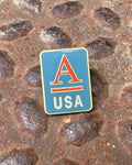 Adorn your handmade ARTIFACT apron or bag with a hard enamel "USA" pin measuring 3/4" wide by 1" tall. Rubber pin back.